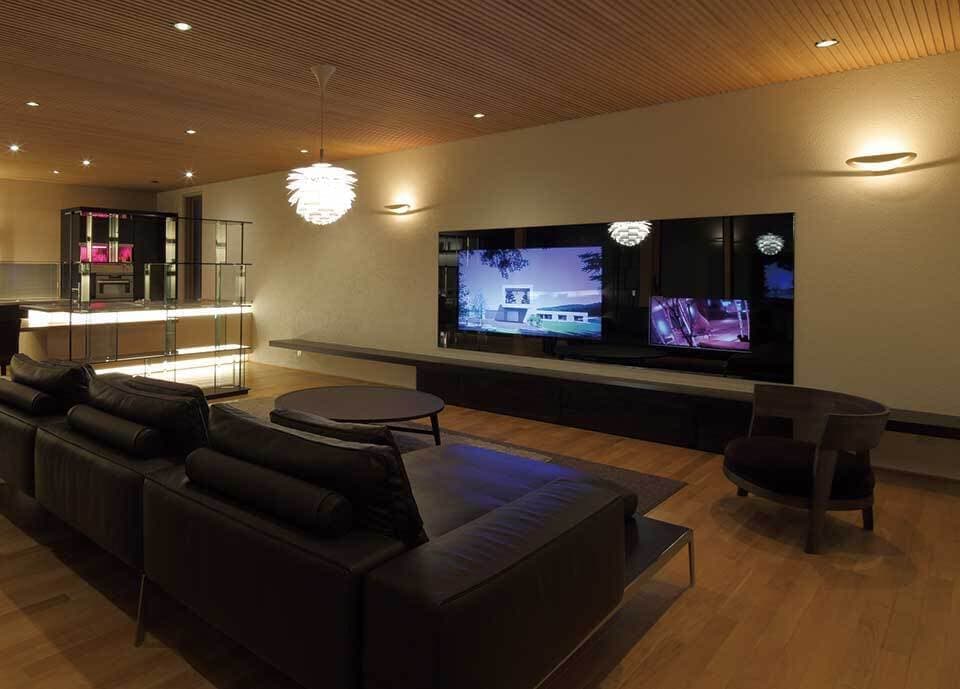 大きなひとつのGLAS LUCEに複数の異なるサイズのディスプレーを入れて大画面ではエンターテイメント、小画面ではニュース、セキュリティーカメラ、BGVを同時に視聴するマルチディスプレーシステム。