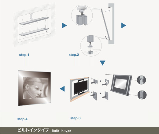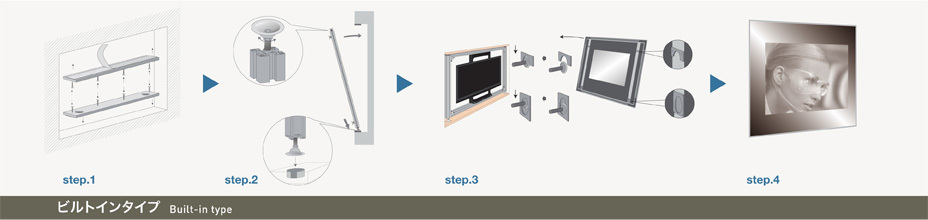 設置方法は壁面に掘り込みを作りその中にアルミフレームユニットとディスプレイを固定しガラス面と壁面をフラットに見せ設置するビルトインタイプがあります。