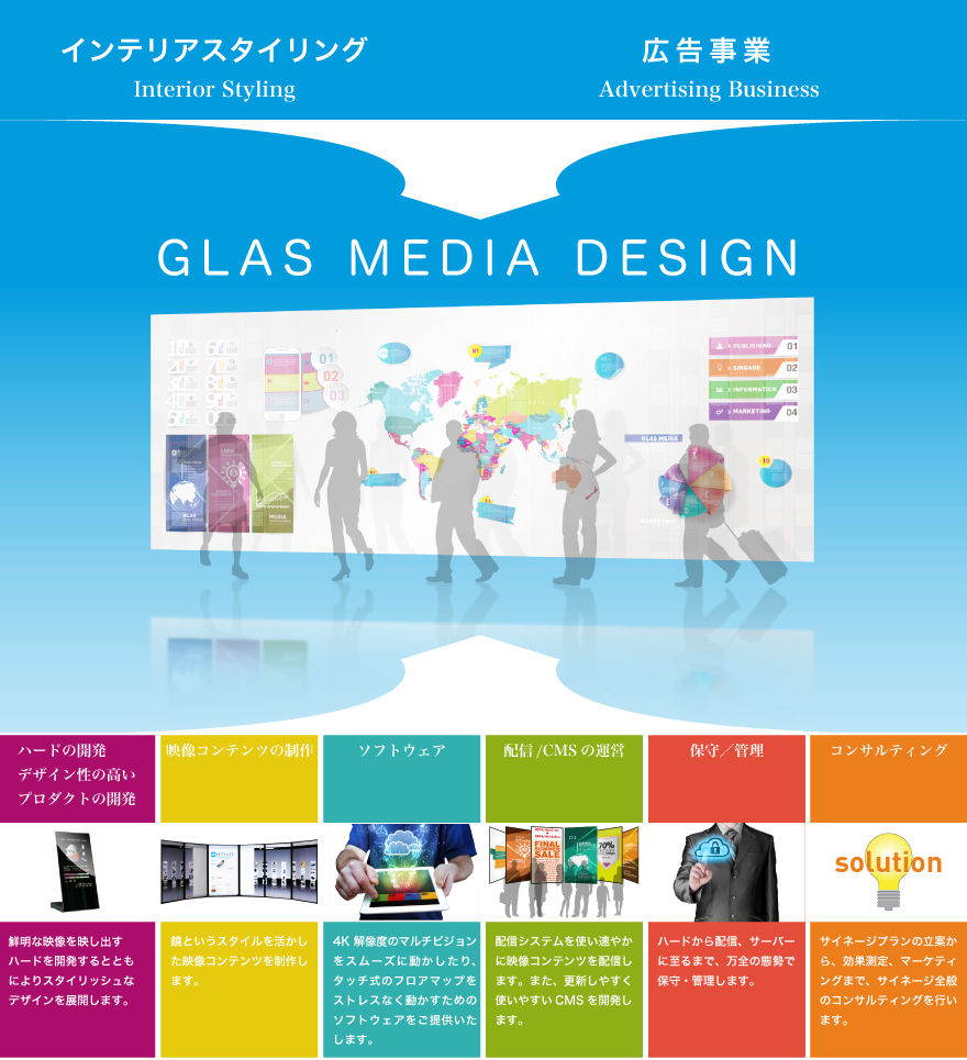 GLAS LUCEの開発・販売にとどまらず、映像コンテンツの制作や配信、さらにGLAS LUCEの特長を活かした空間にマッチするスタイリング・デザインまで、強力なパートナーとともに一元化して臨みます。また、広告の出稿管理やメディアの編成まで、わたくしどもで管理。広告を集めるところまでも一元管理します。
